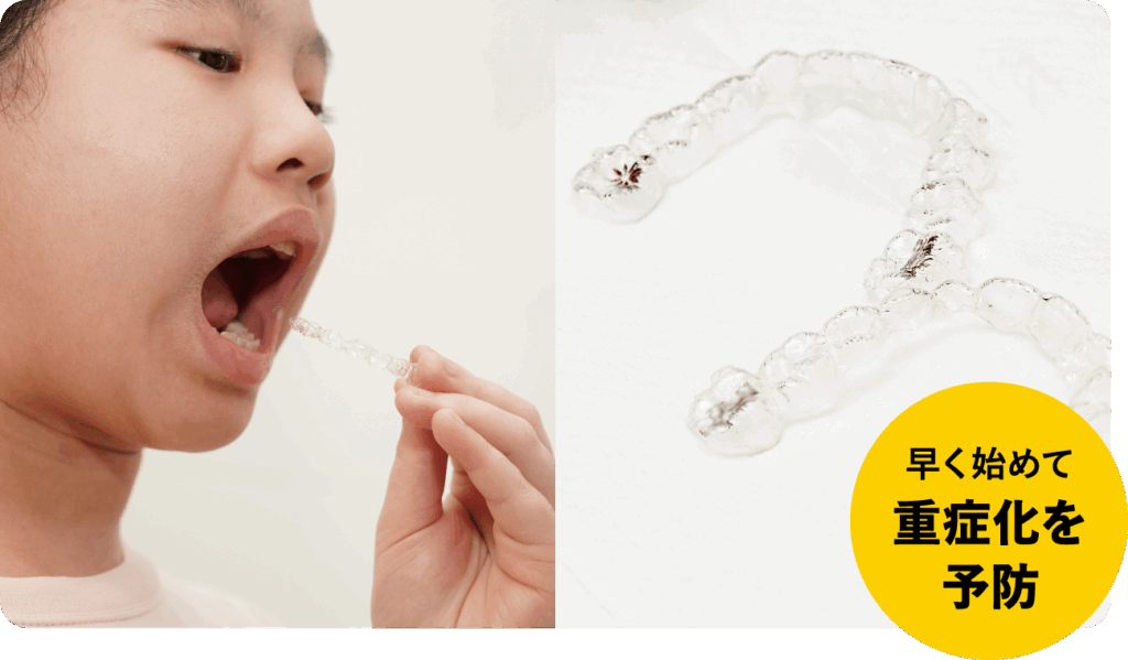 土台となる骨格の成長や、それを阻む間違った口腔機能を改善するためのコースで、重症化を予防します。本来お子さんの持つきれいな歯並びを作る能力を最大限引き出し、自然に歯並びがきれいになることを目指す治療で、主に拡大装置と口腔機能改善マウスピース(マイオブレースやプレオルソ)を使用し、日々のトレーニングで改善を目指します。